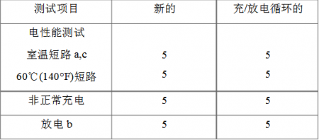 6.2新的二次電芯或電池以及經(jīng)過充放電循環(huán)的二次電芯或電池,按10-19節(jié)要求測試,測試樣品數(shù)量見表6.2。對用戶可更換的二次電芯和電池測試用樣品數(shù)量見表6.4。當一組具有不同尺寸的電芯或電池, 他們采用近似的電化學原理制造,可以選取一個代表尺寸進行測試。